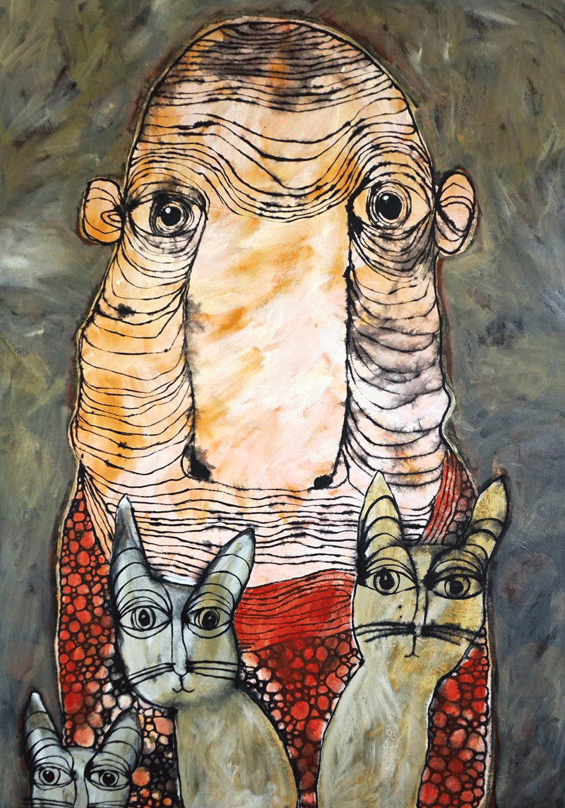 Der Mann mit den Katzen| 2015 | Acryl Pigment auf Leinwand | 120 x 140 cm